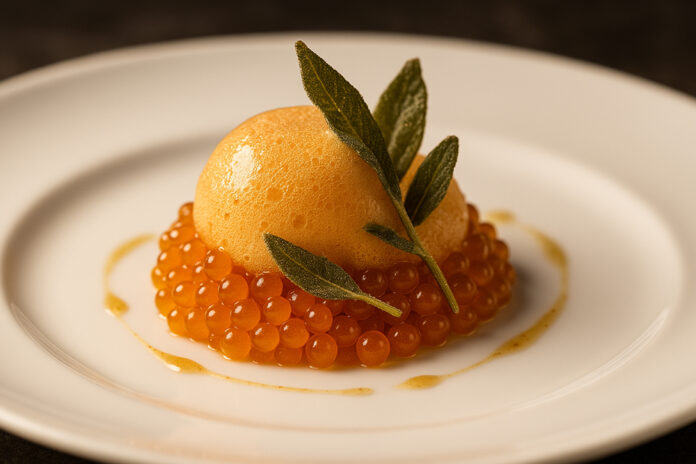 Pumpkin Spice Caviar Spheres with Crispy Sage & Maple Foam