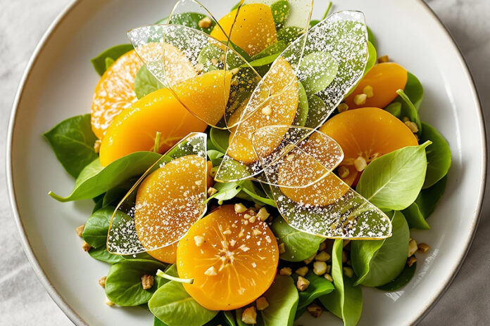 There are salads you toss together, and salads you serve. This one lands in the second category: tender baby spinach, silky-sweet Fuyu persimmon, salty feta, and a bright citrus dressing, finished with crisp shards of za’atar “glass” that crackle when you bite in. It’s the kind of plate that looks effortless, but tastes like you planned it.